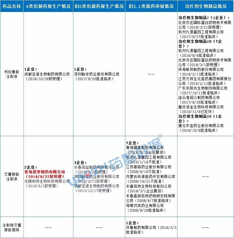 GLP-1類藥物近年來市場發(fā)展迅速,2018年,GLP-1受體激動(dòng)劑類藥物市場規(guī)模達(dá)到93億美元,增長率高達(dá)25%。目前國內(nèi)仿制布局企業(yè)不算太多,布局品種集中在利拉魯肽、艾塞那肽上。進(jìn)度較快的為成都圣諾生物的利拉魯肽注射液、青海晨菲制藥有限公司及無錫和邦生物科技有限公司的艾塞那肽注射液。