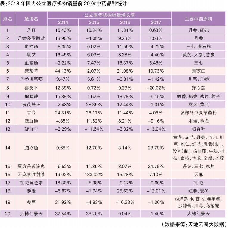 在2018年國內(nèi)公立醫(yī)療機(jī)構(gòu)銷量前20位中藥品種統(tǒng)計(jì)表中,標(biāo)深色的是已被地方納入輔助用藥目錄并重點(diǎn)監(jiān)控的品種,且基本都是在醫(yī)療機(jī)構(gòu)銷售占比過高的中藥注射劑。被重點(diǎn)監(jiān)控后,這些品種臨床銷量預(yù)計(jì)會(huì)出現(xiàn)較大幅度下滑,從而影響丹參、紅花、三七、人參等中藥材的需求量。