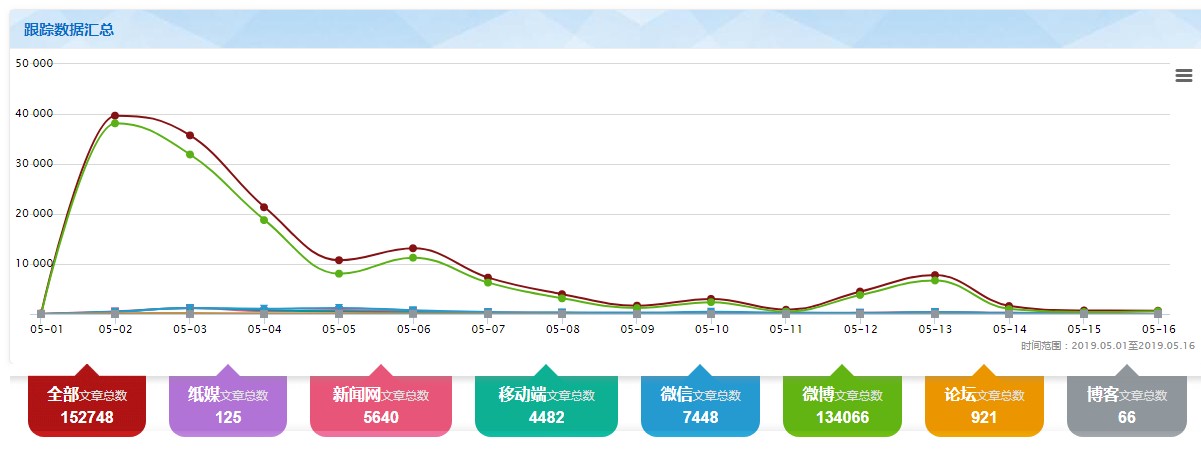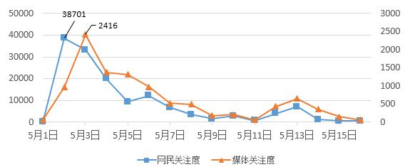 從輿情走勢來看,以5月2日~5月16日為監(jiān)測時間段,如圖1所示,輿情整體呈現(xiàn)“波浪式”特征,網(wǎng)民關(guān)注度遠高于媒體關(guān)注度。