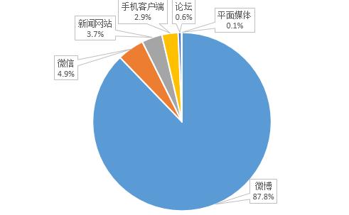 以5月2日~5月16日為監(jiān)測時間段,統(tǒng)計不同媒體平臺報道量。從圖2可以看出,占比較高的信息平臺依次為微博、微信和新聞網(wǎng)站,占比分別為87.8%、4.9%、3.7%。