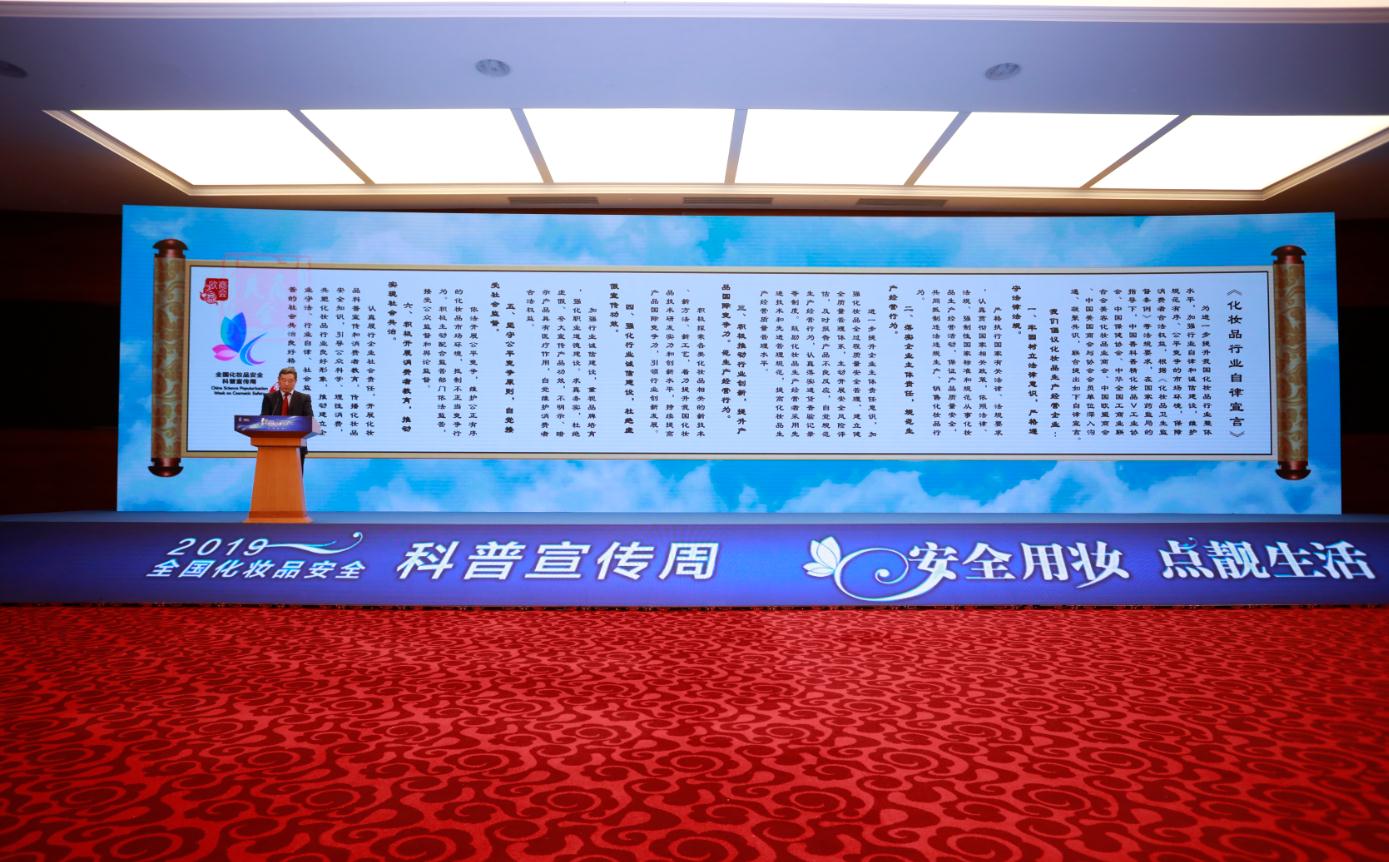 中國(guó)香料香精化妝品工業(yè)協(xié)會(huì)理事長(zhǎng)陳少軍宣讀化妝品行業(yè)自律宣言。賈祺霖 攝