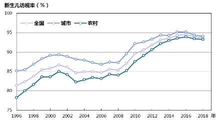 圖14 1996—2018年城鄉(xiāng)新生兒訪視率變化趨勢(shì)