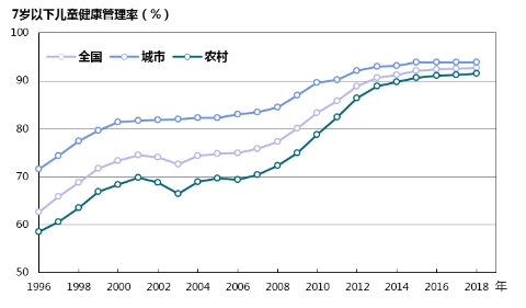 圖16 1996—2018年城鄉(xiāng)7歲以下兒童健康管理率變化趨勢(shì)