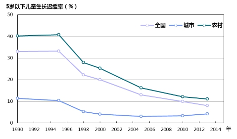 中國(guó)5歲以下兒童生長(zhǎng)遲緩率持續(xù)下降。2013年中國(guó)5歲以下兒童生長(zhǎng)遲緩率為8.1%,與1990年的33.1%相比下降了75.5%。
