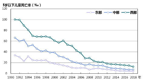 地區(qū)差距持續(xù)縮小。2018年?yáng)|、中、西部地區(qū)5歲以下兒童死亡率分別為4.2‰、7.2‰和12.7‰,較1991年分別下降了87.5%、89.1%和87.3%。東、西部5歲以下兒童死亡率差值由1991年的66.5‰縮小到2018年的8.5‰(圖6)。