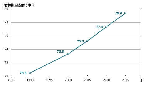 2015年,中國(guó)女性期望壽命為79.4歲,比1990年延長(zhǎng)了8.9歲(圖1)。
