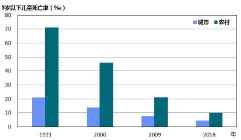 圖5 1991—2018年全國(guó)城鄉(xiāng)5歲以下兒童死亡率比較