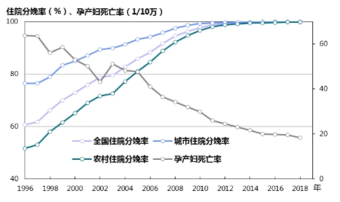 圖10 1996—2018年全國(guó)城鄉(xiāng)住院分娩率與孕產(chǎn)婦死亡率變化趨勢(shì)