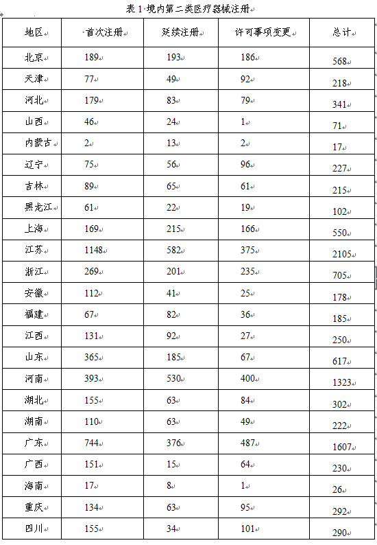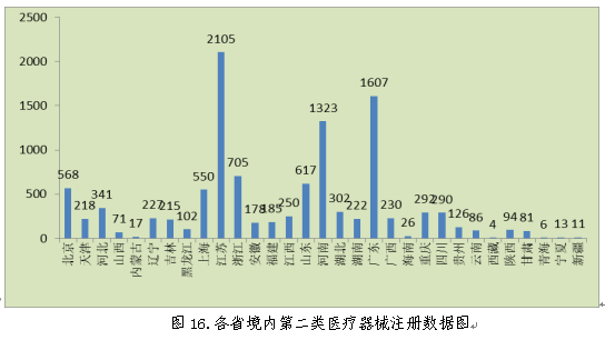 從注冊情況看,江蘇、廣東、河南、浙江、山東、北京、上海七?。ㄖ陛犑校┳缘木硟?nèi)第二類醫(yī)療器械數(shù)量較多。第二類醫(yī)療器械注冊具體數(shù)據(jù)見表1及圖16。