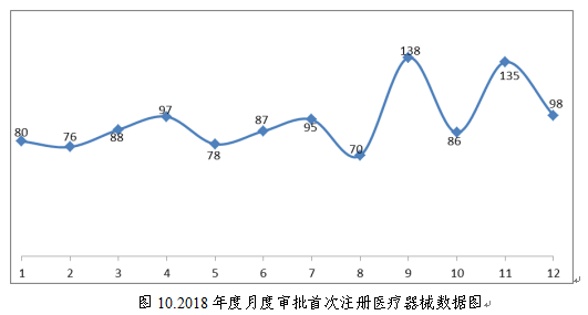 2018年,國家藥品監(jiān)督管理局共批準醫(yī)療器械首次注冊1128項,月度審批情況見圖10。