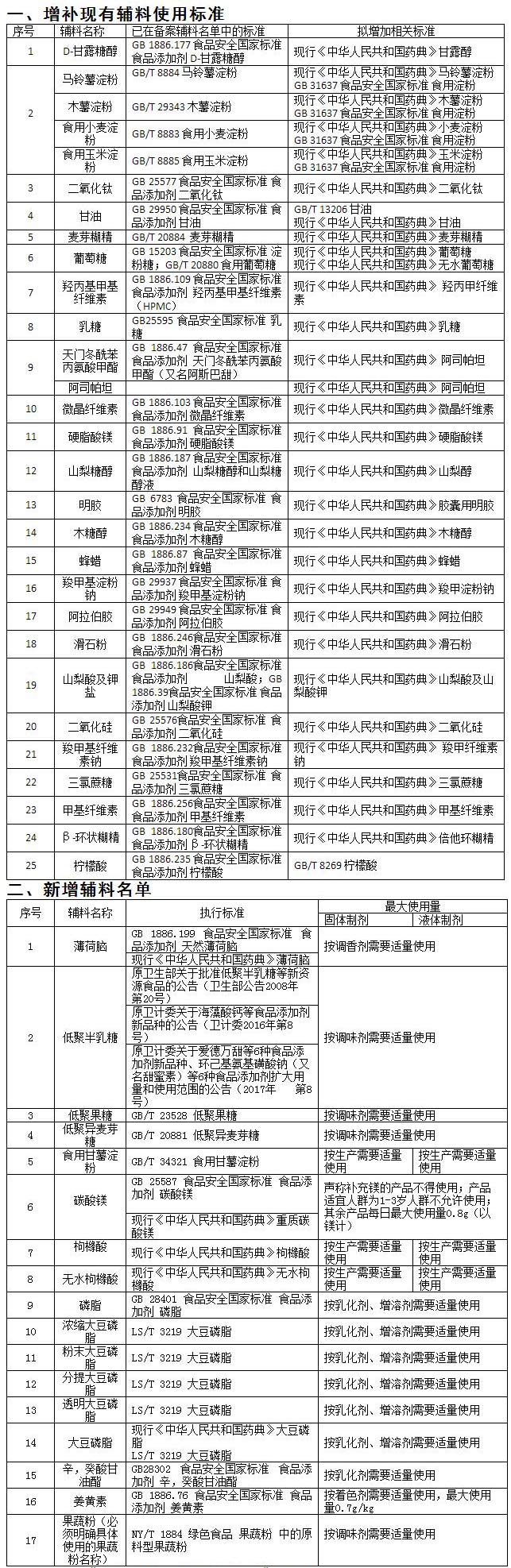 《保健食品備案產品可用輔料增補名單(一)》公開征求意見