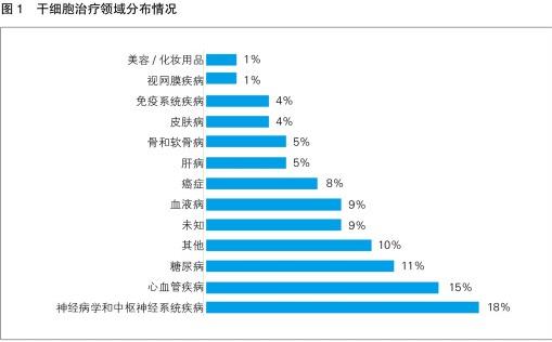 通過對全球主要干細胞研究型企業(yè)所研究的領(lǐng)域進行分析,并根據(jù)其涉及的治療領(lǐng)域,可將干細胞治療劃分為神經(jīng)病學(xué)和中樞神經(jīng)系統(tǒng)疾病(18%)、心血管疾?。?5%)、糖尿?。?1%)、血液?。?%)和癌癥(8%)等大類(見圖1)。