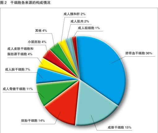 根據(jù)不同的細胞來源,干細胞可劃分為臍帶血干細胞(36%)、成體干細胞(15%)、胚胎干細胞(14%)、成人骨髓干細胞(11%)和成人腦干細胞(7%)等(見圖2)。隨著細胞制備技術(shù)的進步,越來越多的細胞類型在研究中得到應(yīng)用,干細胞的來源類型也將進一步擴充。