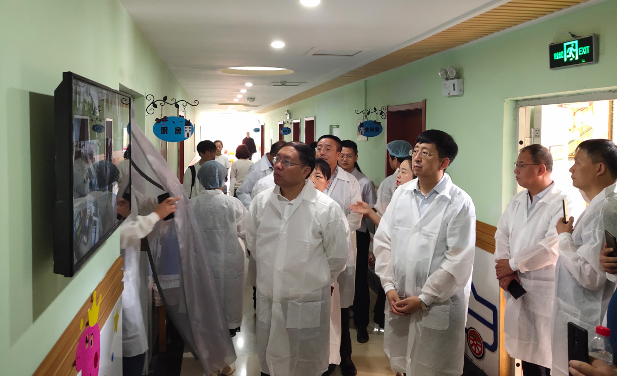 圖為晉中市校園食品安全現(xiàn)場推進會參會人員在左權縣星遼幼兒園實地參觀食品安全管理“明廚亮灶”運行情況。