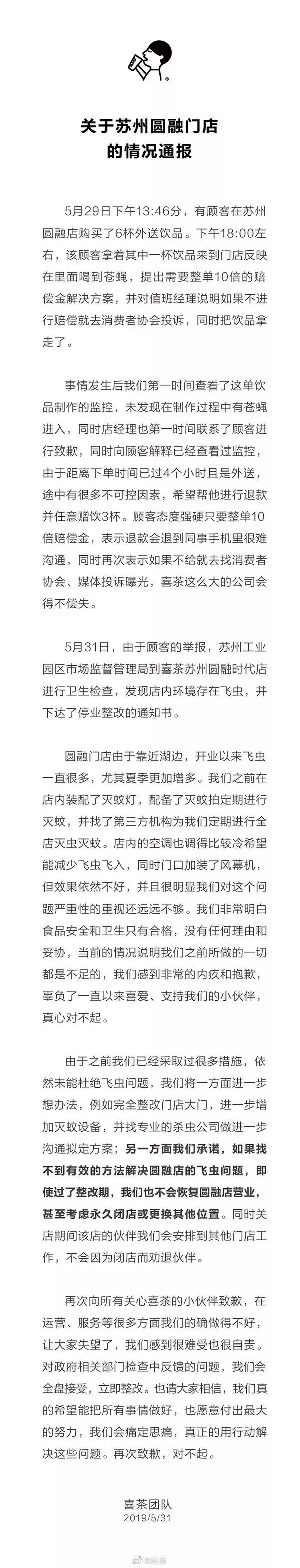 5月31日19時(shí),深圳喜茶投資有限公司官微@喜茶對蘇州圓融店具體情況進(jìn)行了通報(bào),并向廣大消費(fèi)者道歉。喜茶方面表示,第一時(shí)間查看相關(guān)監(jiān)控后,未發(fā)現(xiàn)制作過程中有蒼蠅進(jìn)入,由于上述顧客的購買方式為外送且已過4小時(shí),“途中有很多不可控因素”。喜茶同時(shí)認(rèn)為,食品安全和衛(wèi)生只有合格,沒有任何理由和妥協(xié)。如果找不到有效的方法解決圓融店的飛蟲問題,就不會恢復(fù)圓融店?duì)I業(yè)甚至考慮永久閉店或更換其他位置。對政府相關(guān)部門檢查中反饋的問題,會全盤接受立即整改。界面新聞、東方財(cái)富網(wǎng)等新聞網(wǎng)站,@每日經(jīng)濟(jì)新聞、@ 36氪等微博賬號均轉(zhuǎn)載了相關(guān)信息。少量網(wǎng)民對喜茶的道歉并不認(rèn)可,認(rèn)為喜茶是在找借口。