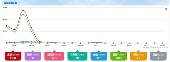 以5月31日~6月19日為監(jiān)測時(shí)間段,輿情出現(xiàn)兩個(gè)峰值,網(wǎng)民關(guān)注度遠(yuǎn)高于媒體關(guān)注度。