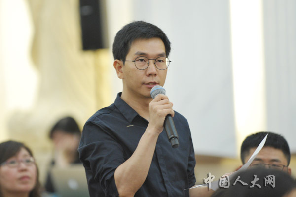 6月29日下午,十三屆全國(guó)人大常委會(huì)第十一次會(huì)議閉幕后,全國(guó)人大常委會(huì)辦公廳在人民大會(huì)堂臺(tái)灣廳召開(kāi)新聞發(fā)布會(huì),全國(guó)人大常委會(huì)法工委、國(guó)家衛(wèi)生健康委、國(guó)家藥監(jiān)局等單位有關(guān)負(fù)責(zé)人出席新聞發(fā)布會(huì),共同回答剛剛通過(guò)的疫苗管理法的有關(guān)問(wèn)題。圖為澎湃新聞?dòng)浾咛釂?wèn)。中國(guó)人大網(wǎng) 陶宏林 攝