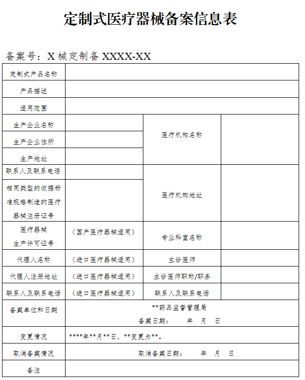 已備案的定制式醫(yī)療器械,備案信息表(見(jiàn)附2)登載內(nèi)容發(fā)生變化的,備案人應(yīng)當(dāng)提交變化情況的說(shuō)明及相關(guān)證明文件,向原備案部門(mén)變更備案信息。備案資料符合形式要求的,省、自治區(qū)、直轄市藥品監(jiān)督管理部門(mén)應(yīng)當(dāng)在變更情況欄中載明變化情況。
