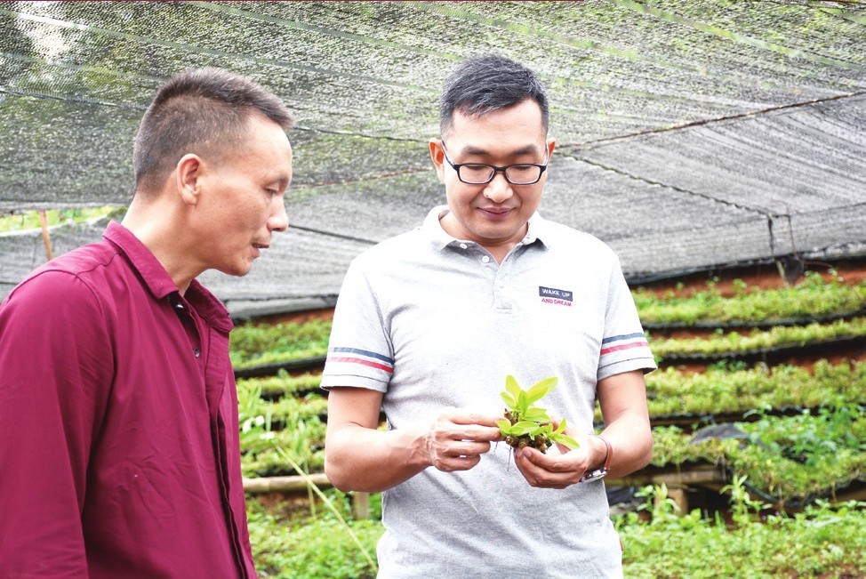 圖為中藥破壁飲片研發(fā)人員(右)考察道地藥材生態(tài)溯源種植基地環(huán)境。 志明 攝