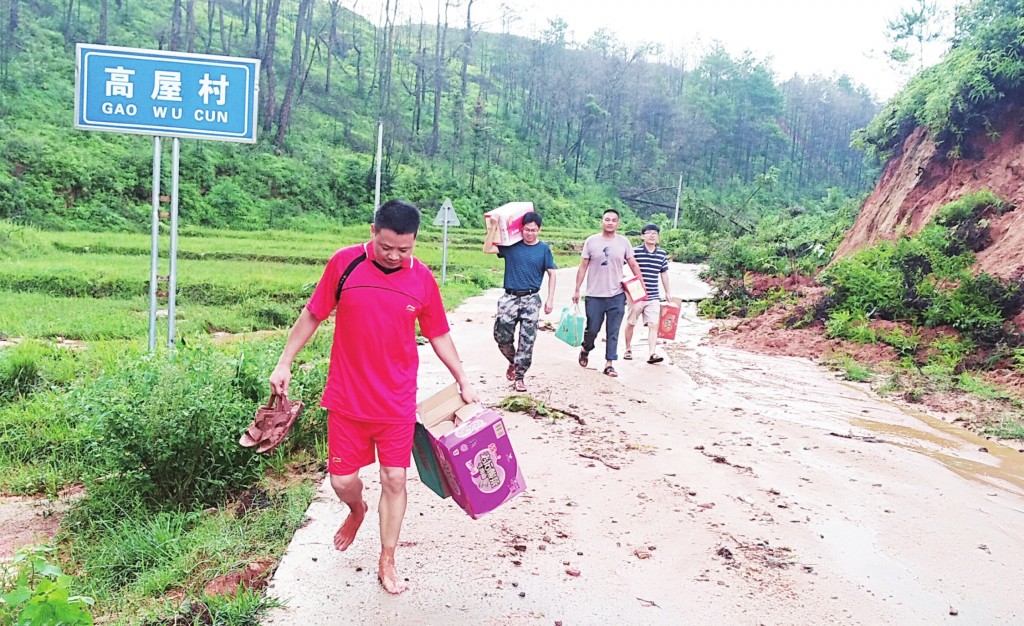 圖為7月14日該局救災(zāi)應(yīng)急分隊在沙心鄉(xiāng)高屋村搬運(yùn)救災(zāi)物資。王雨林、王彥君 攝影報道