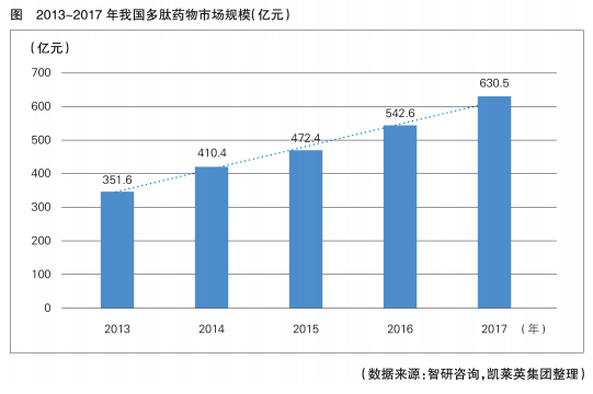 據(jù)中國產(chǎn)業(yè)調(diào)研網(wǎng)發(fā)布的《2019~2025年中國多肽藥物行業(yè)發(fā)展研究分析與發(fā)展趨勢預(yù)測報告》,我國近年來多肽藥物市場規(guī)模同樣呈上升趨勢,2017年達到630.5億元(見圖),這要歸因于我國人口基數(shù)大、老齡化加劇,存在大量的腫瘤及慢性病患者。預(yù)計未來這一市場需求將不斷擴大,多肽藥物仍有大幅增長空間。
