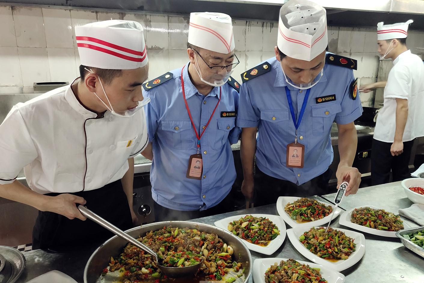 圖為執(zhí)法人員正在一酒店檢測菜品溫度。王雨林 攝