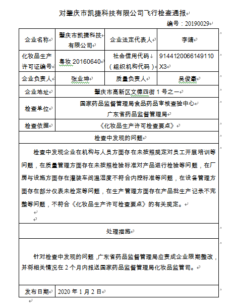飛檢通報(bào):對(duì)肇慶市凱捷科技有限公司飛行檢查通報(bào)