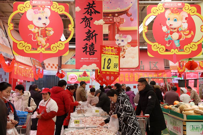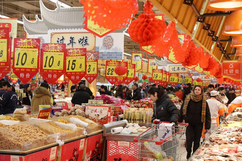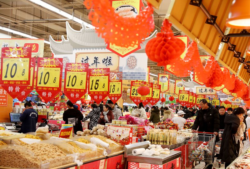 隨著春節(jié)的臨近,安徽省淮北市各大市場、商超積極組織貨源,加大供應,在保障商品供應充足。(李鑫 攝)