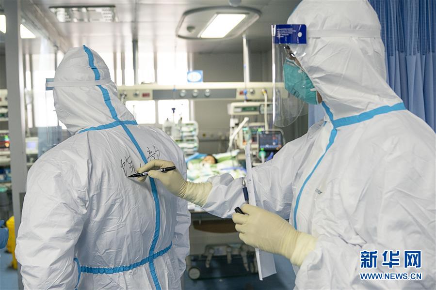1月24日,在武漢大學中南醫(yī)院重癥隔離病房,醫(yī)護人員在隔離服上寫下名字,方便辨認。新華社記者 熊琦 攝
