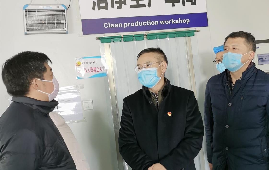 圖為河南省藥監(jiān)局黨組書記雷生云(中)檢查醫(yī)用防護(hù)類醫(yī)療器械生產(chǎn)企業(yè)。