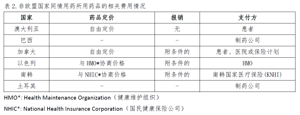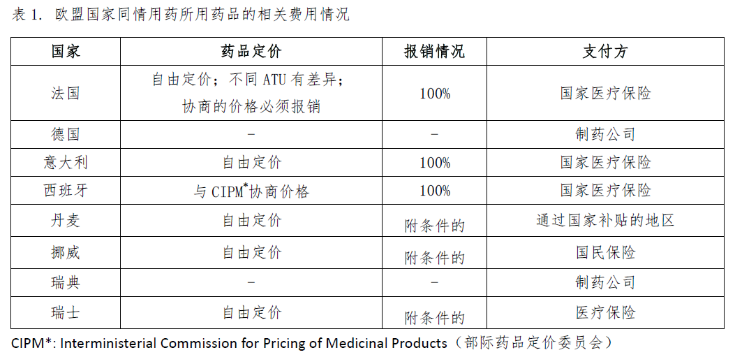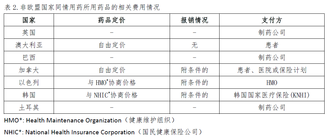 不同的國(guó)家和地區(qū)關(guān)于同情用藥的藥品定價(jià)、報(bào)銷比例以及費(fèi)用支付方的規(guī)定不盡相同,詳見(jiàn)表1和表2。