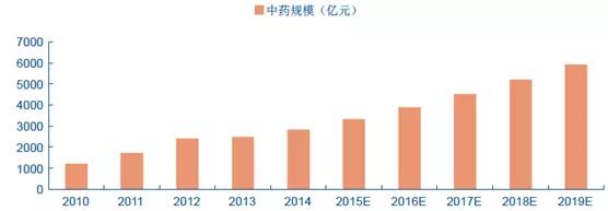 圖一:2010年-2019年中藥市場規(guī)模統(tǒng)計及預(yù)測