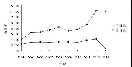 圖二:2004年-2013年中藥專利申請量及授權(quán)量