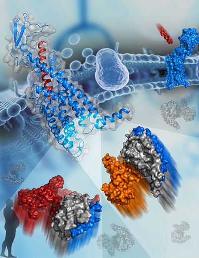 胰高血糖素受體GCGR的三維結(jié)構(gòu)示意圖。GCGR參與調(diào)節(jié)人體內(nèi)血糖穩(wěn)態(tài),是治療2型糖尿病藥物的重要靶點(diǎn)。圖中左上角GCGR的三維結(jié)構(gòu)以藍(lán)色飄帶圖顯示,GCGR的天然配體胰高血糖素以紅色飄帶顯示;圖下方為與GCGR結(jié)合的兩種G蛋白,以表面圖顯示,其中,Gs蛋白的三個(gè)亞基分別用橙色、灰色和藍(lán)色顯示,Gi蛋白的三個(gè)亞基分別用紅色、灰色和藍(lán)色顯示。(圖片由中科院上海藥物所吳蓓麗研究組提供)