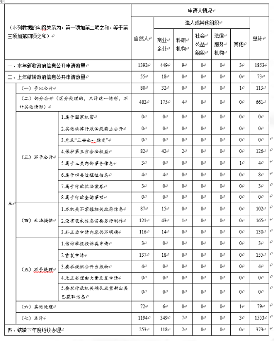 一是申請(qǐng)情況。2019年,新收到有效依申請(qǐng)公開事項(xiàng)1853件,其中,申請(qǐng)人為自然人1392件,占75.1%;申請(qǐng)人為商業(yè)企業(yè)449件,占24.2%;申請(qǐng)人為科研機(jī)構(gòu)9件,占0.5%。從申請(qǐng)渠道來看,通過在線平臺(tái)申請(qǐng)1585件,占85.5%;以信函形式申請(qǐng)225件,占12.1%;以傳真形式申請(qǐng)31件,占1.7%;當(dāng)面遞交申請(qǐng)12件,占0.7%。