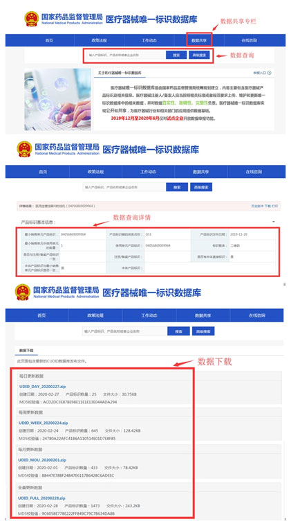 2019年12月10日,醫(yī)療器械唯一標(biāo)識(shí)數(shù)據(jù)庫正式上線,并對(duì)試點(diǎn)企業(yè)開啟申報(bào)功能。3月31日,數(shù)據(jù)庫進(jìn)一步開放數(shù)據(jù)庫共享功能,以查詢、下載、接口對(duì)接等三種方式,供公眾、醫(yī)療器械生產(chǎn)經(jīng)營(yíng)企業(yè)和醫(yī)療機(jī)構(gòu)等各方查詢使用。