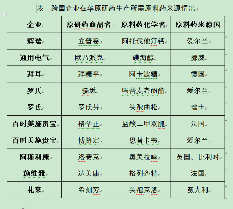 表 跨國企業(yè)在華原研藥生產(chǎn)所需原料藥來源情況