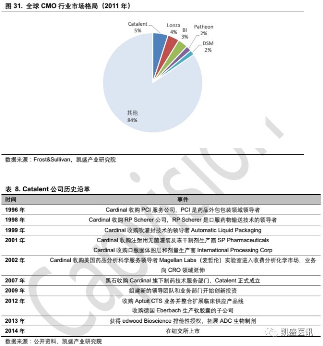 中國食品藥品網(wǎng)訊 協(xié)助各大藥企有效降低成本、提升研發(fā)效率的醫(yī)藥外包服務(wù)已成為制藥產(chǎn)業(yè)鏈中不可缺失的一環(huán),全球醫(yī)藥外包服務(wù)產(chǎn)業(yè)在40多年時間里迅速成長為了市場規(guī)模超千億美元的產(chǎn)業(yè)。以腫瘤藥/孤兒藥+Biotech為驅(qū)動力的本輪全球新藥研發(fā)潮,給全球新藥研發(fā)外包行業(yè)帶來了新的動力。 分析國際巨頭CRO及CMO公司的發(fā)展路徑可以發(fā)現(xiàn),行業(yè)內(nèi)的重組兼并將是行業(yè)發(fā)展的必然趨勢,頭部企業(yè)將利用自身的資本優(yōu)勢,通過收購、合并加速業(yè)務(wù)范圍拓展及產(chǎn)能建設(shè),打造全方位一體化服務(wù)平臺,持續(xù)滿足不同客戶的需求,以穩(wěn)固行業(yè)龍地位。 LabCorp、IQVIA兩大收入過百億美元CRO的發(fā)展路徑——外延并購加速一體化平臺建設(shè),市場與服務(wù)范圍的雙重拓寬迅速打開公司成長天花板。 相較于較為分散的國內(nèi)CRO市場,全球CRO市場集中度較高,以收入計2017年TOP6企業(yè)所占市場份額為56%。在早期,LabCorp、IQVIA等全球TOP10 CRO&CMO企業(yè)均以服務(wù)范圍較小的單一服務(wù)起家,伴隨全球醫(yī)藥行業(yè)精細化分工趨勢的不斷加深,這些公司在成長的過程中不斷積累資金,通過收購合并策略快速拓展業(yè)務(wù)及客戶范圍。2017年,LabCorp與IQVIA全球市場所占份額已近乎三分之一,其中LabCorp占 20%,IQIVA 占18%. 醫(yī)療診斷服商LabCorp于2015年完成了醫(yī)藥外包行業(yè)最大規(guī)模的收購,以61億美元對Covance進行了收購,自此成為全球醫(yī)藥外包行業(yè)排名第一的龍頭企業(yè)(僅以原Covance業(yè)務(wù)收入進行計算)。 Covance的前身于1968年成立于美國,主要提供實驗動物相關(guān)設(shè)備,1972年該公司收購了毒性測試提供商Hazleton Laboratories并改名Hazleton,隨后公司逐漸發(fā)展成為美國最大的生物測試公司和生命科學(xué)實驗室,可為藥物、化妝品、農(nóng)藥、化工產(chǎn)品提供相關(guān)獨立測試服務(wù)。之后,公司與臨床服務(wù)公司Besselaar及SciCor共同成為康寧玻璃旗下的醫(yī)藥服務(wù)部門。1996年4月,康寧拆分了相關(guān)實驗室和制藥服務(wù)公司,組建了兩家新公司Quest Diagnostics和Covance,Covance作為獨立公司1997年1月在紐交所上市。Covance公司上市后開始了不斷的收購擴張之路,業(yè)務(wù)范圍也逐漸從毒理測試擴大至藥物發(fā)現(xiàn)、臨床研究、中心實驗室、生物標(biāo)記物分析、市場咨詢、CMC服務(wù)等。在長達五十年的發(fā)展過程中,Covance公司不斷通過對外進行收購合并成為了全球服務(wù)范圍最為全面的醫(yī)藥外包企業(yè)之一。 Catalent、Lonza兩大CMO的發(fā)展路徑——通過收購合并加速業(yè)務(wù)拓展及產(chǎn)能建設(shè),全方位服務(wù)平臺奠定絕對龍頭地位。 全球CMO行業(yè)集中度較低,TOP5企業(yè)市場份額總額僅16%。 Catalent(康泰倫特)成立于2007年,總部位于美國的特拉華州,是美國最大的醫(yī)藥定制研發(fā)生產(chǎn)企業(yè),主要提供先進的藥物傳輸技術(shù)、生物制品和健康產(chǎn)品的開發(fā)解決方案,其曾參與50%以上的美國FDA批準(zhǔn)的新藥項目的研發(fā)及生產(chǎn)。Catalent的業(yè)務(wù)最早可追溯到1996年,當(dāng)時的Cardinal公司收購了藥物外包裝業(yè)務(wù)領(lǐng)先公司PCI。在些之后的1998-2002年間,又陸續(xù)收購了RP Scherer、AutomaticLiquid Packaging,SPPharmaceuticals等公司,獲得了全球領(lǐng)先的口服藥物輸送、吹灌封技術(shù)、無菌灌裝技術(shù)、口服固體涂層技術(shù),逐漸成長為CMO領(lǐng)域的龍頭企業(yè)。2007年,Cardinal 的CMO業(yè)務(wù)被收購后被獨立出來,Catalent正式成立。自此,Catalent利用自身資本優(yōu)勢走上了通過兼并收購不斷擴大業(yè)務(wù)范圍的快速成長路徑。 Lonza(龍沙)集團是一家具有100多年歷史,總部位于瑞士巴塞爾,以生命科學(xué)為主導(dǎo),在生物化學(xué)、精細化工、功能化學(xué)等行業(yè)均處于領(lǐng)先地位的全球性跨國公司。2017年,龍沙在全球有14618名員工,在全球三大洲建有29個主要生產(chǎn)基地。 20世紀(jì)90年代之前,一些大型醫(yī)藥公司通過利用過剩的產(chǎn)能提供生產(chǎn)服務(wù),這是最初CMO服務(wù)的雛形。在當(dāng)時的行業(yè)環(huán)境下,Lonza利用API業(yè)務(wù)成功進入了CMO行業(yè)。1990-2007年期間,該公司先后收購了一家捷克的生物技術(shù)工廠、CellTech Biologics、UCB生物產(chǎn)品制造部門、Cambrex生物產(chǎn)品和生物制藥業(yè)務(wù)及Cambrex旗下生物試劑業(yè)務(wù)等。2008-2013年期間,在經(jīng)濟寒冬下,CMO行業(yè)進行了重新洗牌,Lonza借機發(fā)動了密集的連續(xù)性并購,使其業(yè)務(wù)鏈向藥物發(fā)現(xiàn)等前端延伸,同時繼續(xù)擴大新型生物藥的產(chǎn)能,成為了全球CMO行業(yè)不可撼動的生物制劑醫(yī)藥外包龍頭企業(yè)。