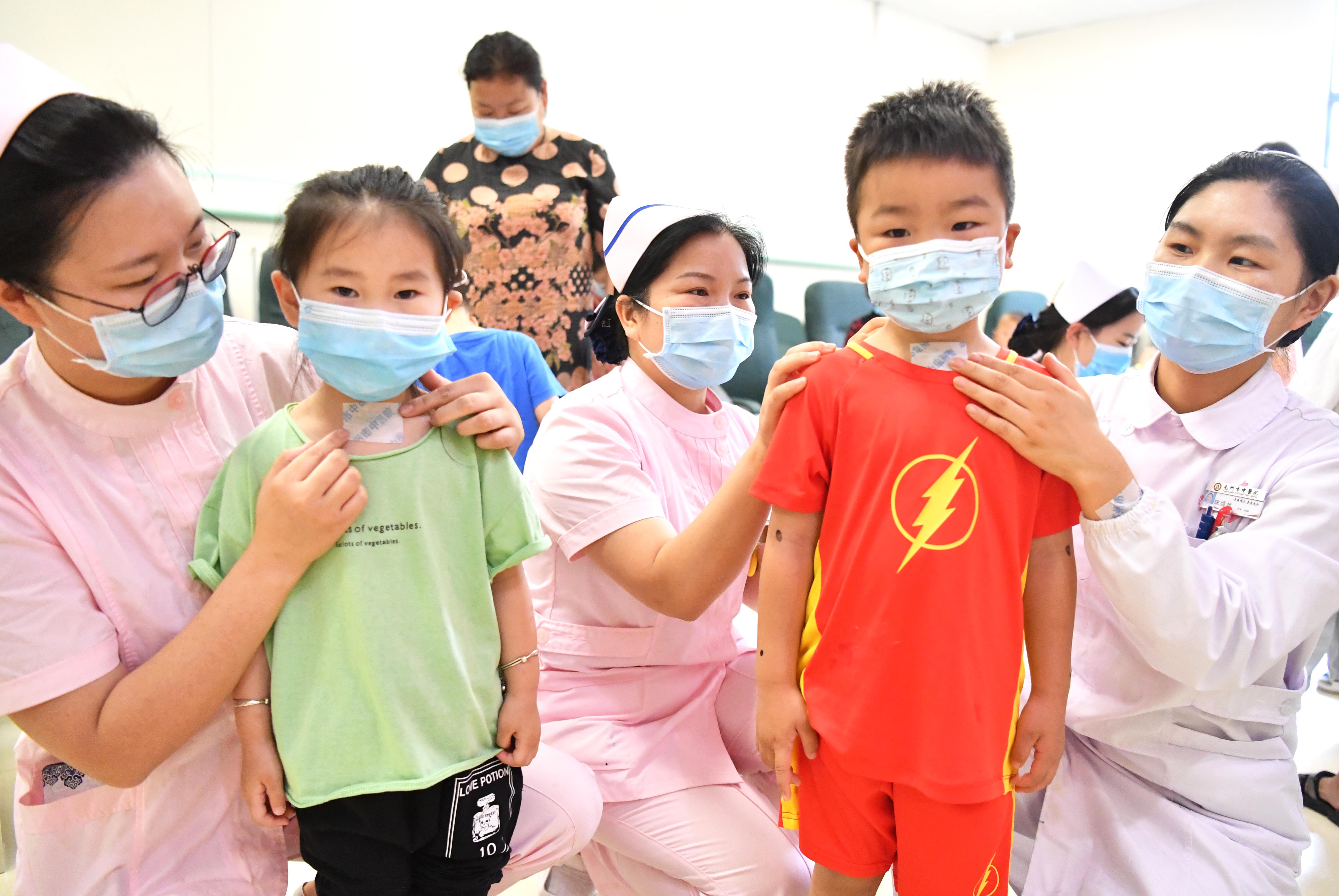 6月21日,在安徽省亳州市中醫(yī)院,醫(yī)護(hù)人員為小朋友貼“三伏貼”。(劉勤利 攝)