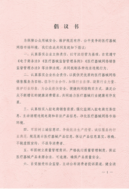會上,參會的10家企業(yè)代表共同發(fā)起規(guī)范醫(yī)療器械網(wǎng)絡(luò)市場秩序倡議,并簽署倡議書,承諾將認(rèn)真落實相關(guān)責(zé)任,以守法經(jīng)營為基準(zhǔn),自覺遵守法律法規(guī)要求,共同抵制各種違法違規(guī)行為;以提供更優(yōu)質(zhì)的醫(yī)療器械網(wǎng)絡(luò)銷售服務(wù)為目標(biāo),加強(qiáng)行業(yè)自律,共同營造醫(yī)療器械網(wǎng)絡(luò)銷售的良好環(huán)境,營造社會共治的良好氛圍,促進(jìn)醫(yī)療器械產(chǎn)業(yè)高質(zhì)量健康發(fā)展。