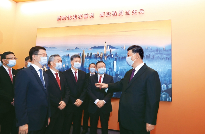 2020年10月14日,深圳經(jīng)濟(jì)特區(qū)建立40周年慶祝大會(huì)在廣東省深圳市隆重舉行。中共中央總書記、國(guó)家主席、中央軍委主席習(xí)近平在會(huì)上發(fā)表重要講話。這是當(dāng)天上午,習(xí)近平等參觀“從先行先試到先行示范——慶祝深圳經(jīng)濟(jì)特區(qū)建立40周年展覽”。新華社記者 鞠鵬/攝