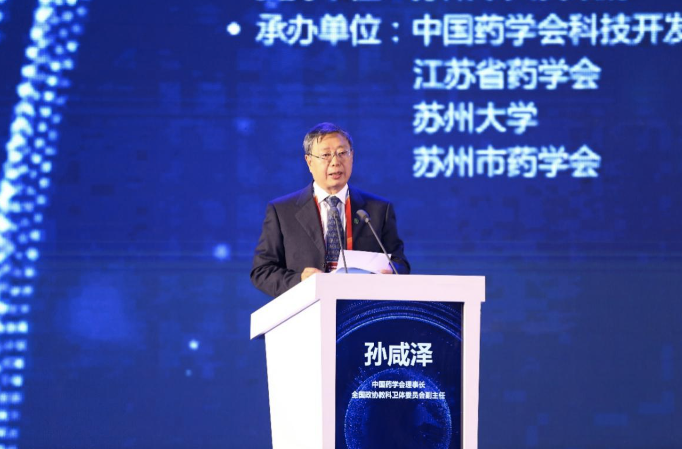 圖為中國(guó)藥學(xué)會(huì)理事長(zhǎng)、全國(guó)政協(xié)教科衛(wèi)體委員會(huì)副主任孫咸澤致辭。