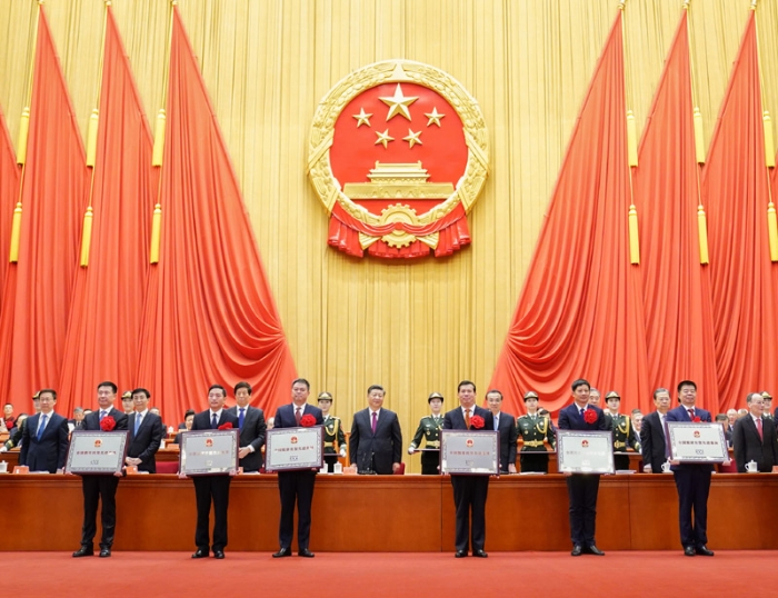 習(xí)近平等為受表彰的個(gè)人和集體代表頒獎(jiǎng)。