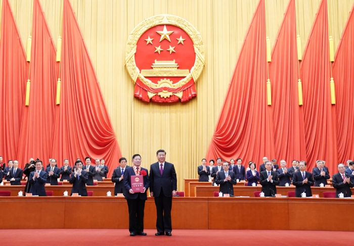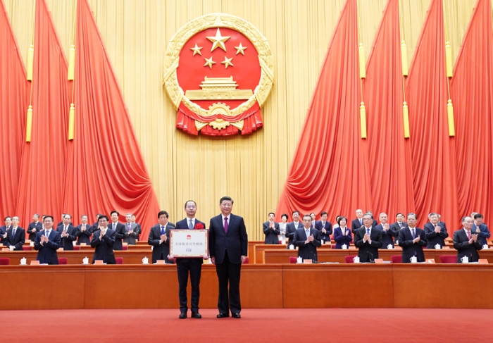2月25日,全國脫貧攻堅(jiān)總結(jié)表彰大會(huì)在北京人民大會(huì)堂隆重舉行。這是習(xí)近平為全國脫貧攻堅(jiān)楷模榮譽(yù)稱號(hào)獲得者國網(wǎng)西藏電力有限公司農(nóng)電工作部頒獎(jiǎng)。新華社記者 李學(xué)仁 攝