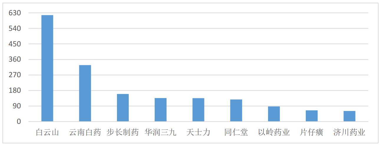 從總營收來看,如圖3所示,9家企業(yè)中,白云山總營收最高,達(dá)616.74億元,且超過第二名云南白藥近1倍,而云南白藥的總營收又是排名第三的步長制藥的1倍多。