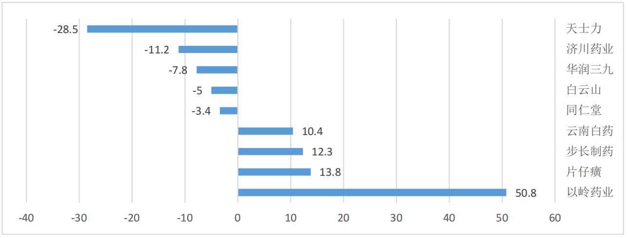 圖4 9家中藥公司2020年總營收增幅對(duì)比(單位:百分比)