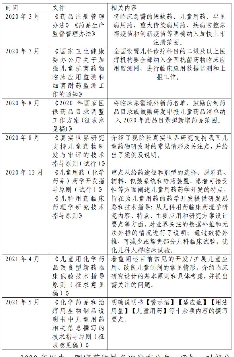 2020年以來,國家藥監(jiān)局多次發(fā)布公告、通知,對部分涉兒童藥品進(jìn)行注銷或要求修訂藥品說明書中涉及兒童的部分,其中涉及的藥品類型包括退熱、抗腫瘤、精神科藥品等,如表2所示。同時(shí),創(chuàng)新兒童藥品也被納入優(yōu)先審評。根據(jù)《中國醫(yī)藥報(bào)》刊登的《全力破解兒童用藥短缺難題》,數(shù)據(jù)顯示,截至目前,通過優(yōu)先審評通道獲批上市的兒童用藥累計(jì)達(dá)32個(gè),2021年至今已有12個(gè)兒童用藥獲批上市,完成數(shù)量及審評速度均有明顯提升。2021年5月31日,國家藥監(jiān)局藥品審評中心網(wǎng)站正式開通“兒童用藥專欄”。欄目匯集兒童用藥領(lǐng)域的政策法規(guī)、技術(shù)指南等信息,未來將成為企業(yè)、醫(yī)生、公眾了解國家兒童用藥政策法規(guī),把握研發(fā)技術(shù)要求,與藥監(jiān)部門互動(dòng)溝通的重要窗口。