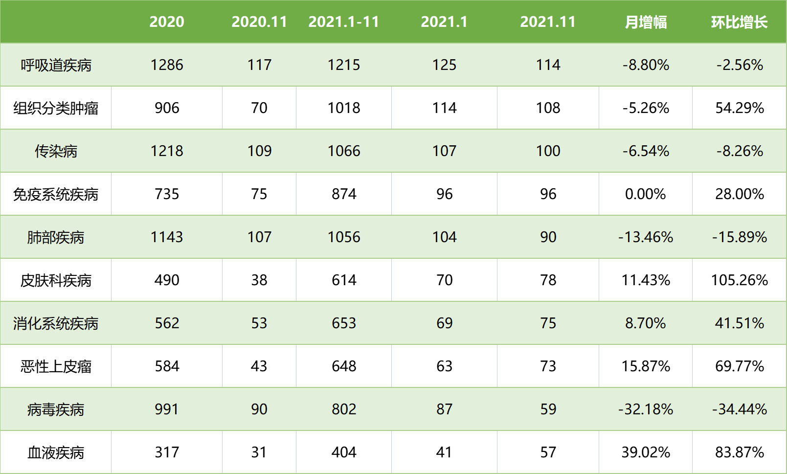 從11月新增臨床試驗的熱門適應癥領域來看,呼吸道疾病仍為最主要的熱門研發(fā)領域,新開展臨床試驗數(shù)量114項,相較于10月下降8.80%,相較于去年同期下降2.56%。11月主要熱門適應癥的臨床試驗相較于10月普遍出現(xiàn)下降趨勢,其中下降幅度最高的是病毒疾病,下降幅度達到32.18%。增長率較高的熱門適應癥為惡性上皮瘤疾病和血液疾病,由此推測疫情相關臨床試驗數(shù)量顯著下降。