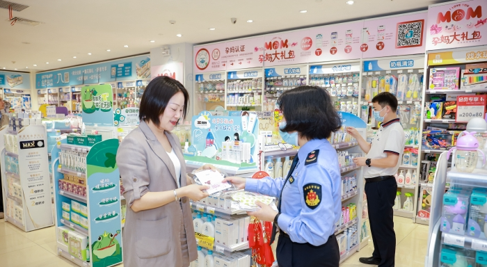 圖1為2021年5月26日,上海市楊浦區(qū)五角場(chǎng)市場(chǎng)監(jiān)管所監(jiān)管人員在一家母嬰用品專賣店開展兒童化妝品專項(xiàng)檢查,向經(jīng)營(yíng)人員宣傳兒童化妝品安全知識(shí)。張玲攝