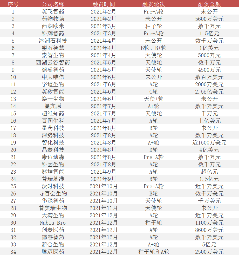 無論是“老兵”還是“新兵”,優(yōu)秀的AI制藥選手們都在資本市場上獲得了認可。據不完全統(tǒng)計,2021年,國內AI制藥領域共發(fā)生34起融資事件(其中3起融資事件未披露融資輪次,4起融資事件未披露融資金額),涉及融資總金額為834521.36萬元,平均單筆融資金額為24544.75萬元。
